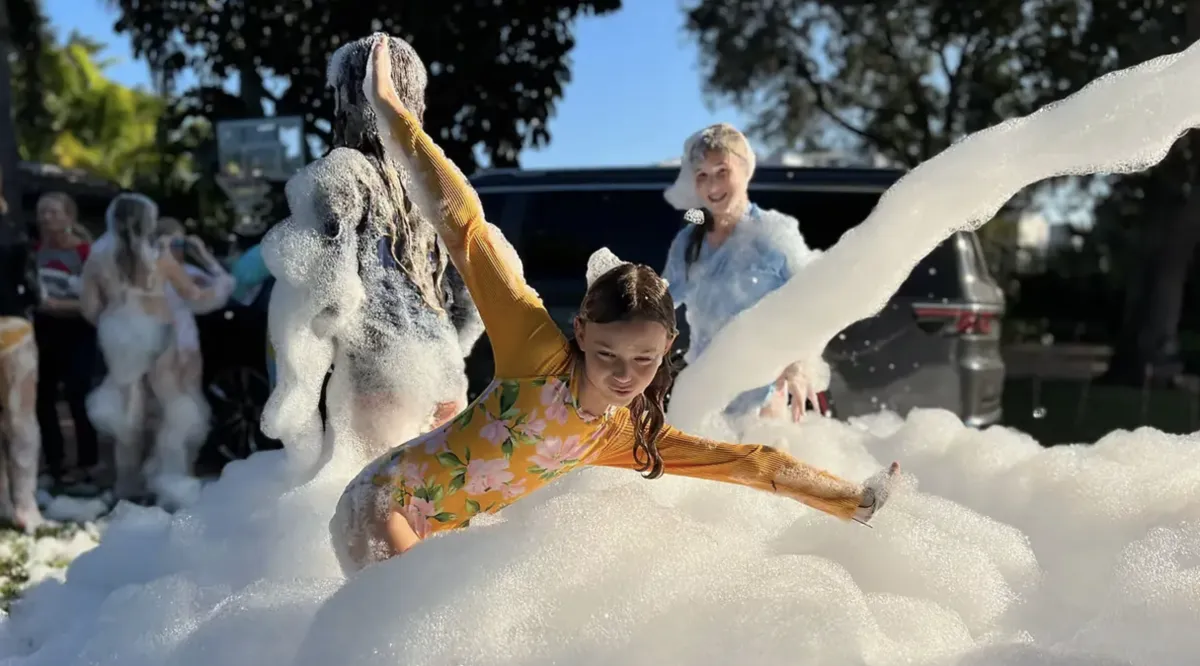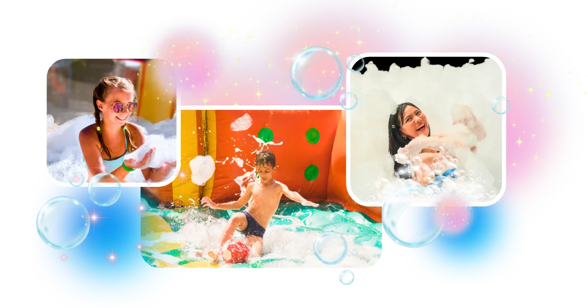 Our massive foam cannon sprays out streams of lightweight, safe, and super fun soapy foam for kids to dive into—and as a bonus, they might leave squeaky clean! 😄